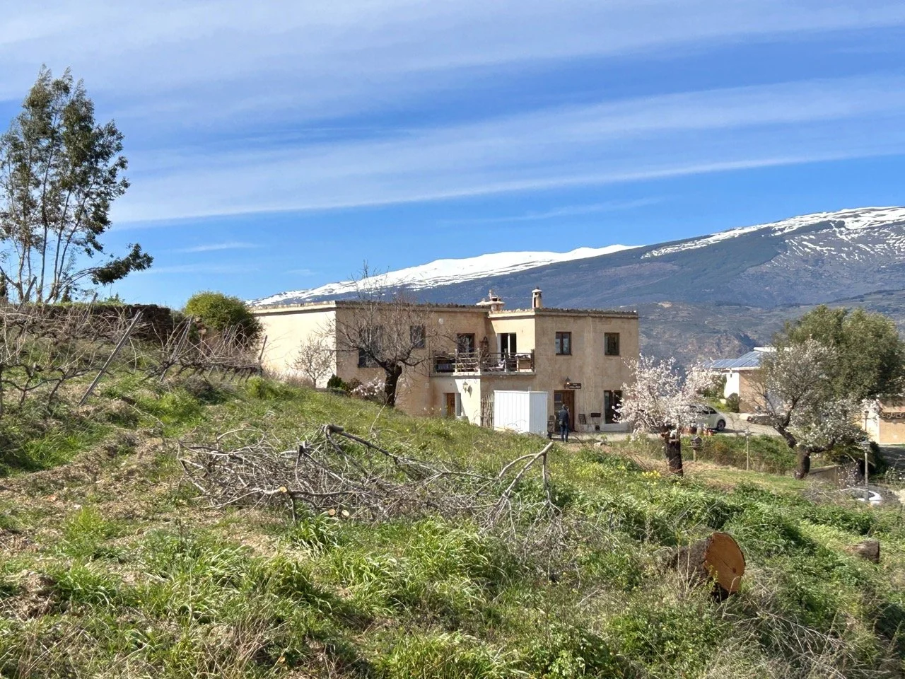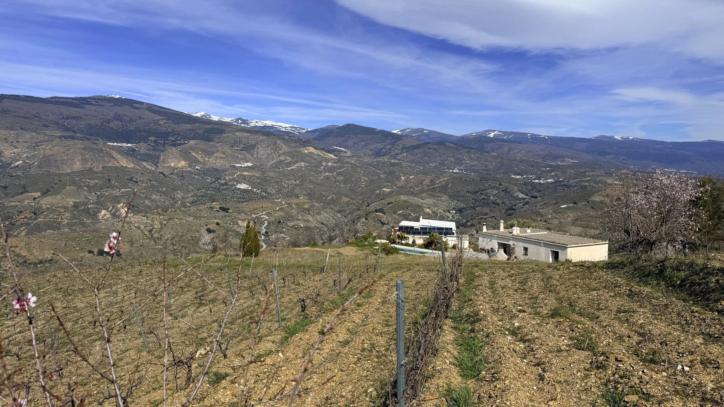 The cortijo sits 1.5 kms up the side of the Contraviesa, the foothills that separate the Alpujarras from the coast. From the property, almost the entire length of the Sierra Nevada can be seen and the main focus is Mulhacén, the highest peak in the range. To the west can be seen the mountains above the Lecrín Valley and towards the east can be seen the villages dotting the Alpujarras towards Yegen and Valor.
