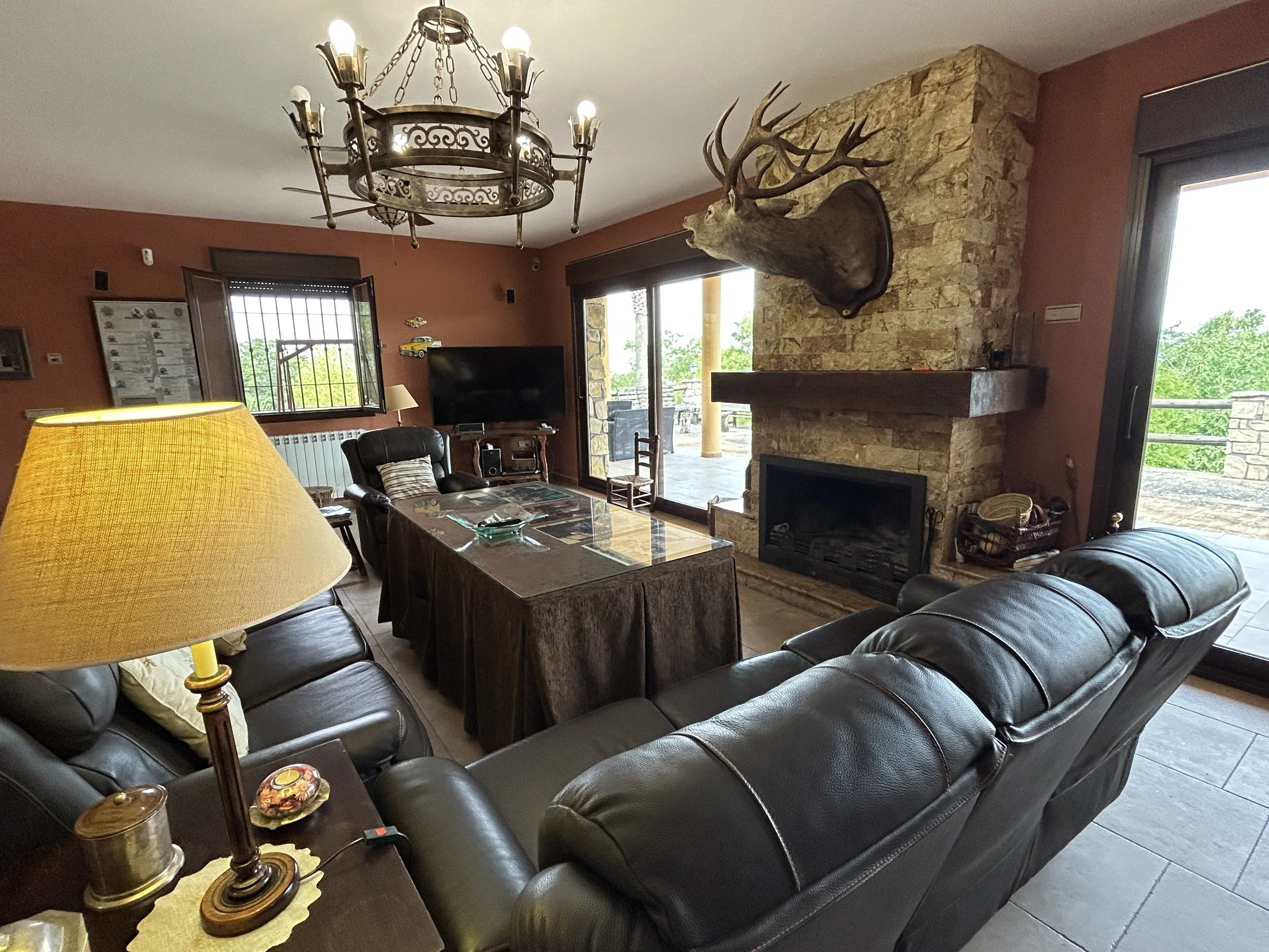 The main living room is a large and elegant space with two enormous sets of sliding doors opening onto the verandah; the views from here are magnificent. Between the two sets of doors there is an open fireplace, and walls of exposed stonework add character and warmth.